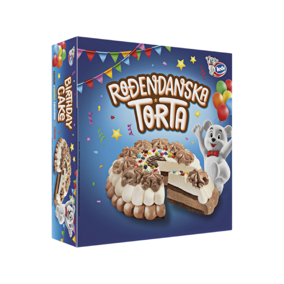 Torta za rojstni dan (Rojtsnodnevna torta) je napolnjena s sladoledom z okusoma nugata in vanilije, ter je okrašena s pisanimi čokoladnimi bomboni in s čokoladno ploščico s podobo vsem priljubljenega Leda Meda. Vašim najmlajšim članom družine privoščite praznovanje rojstnega dne, ki bo ostalo v lepem spominu.